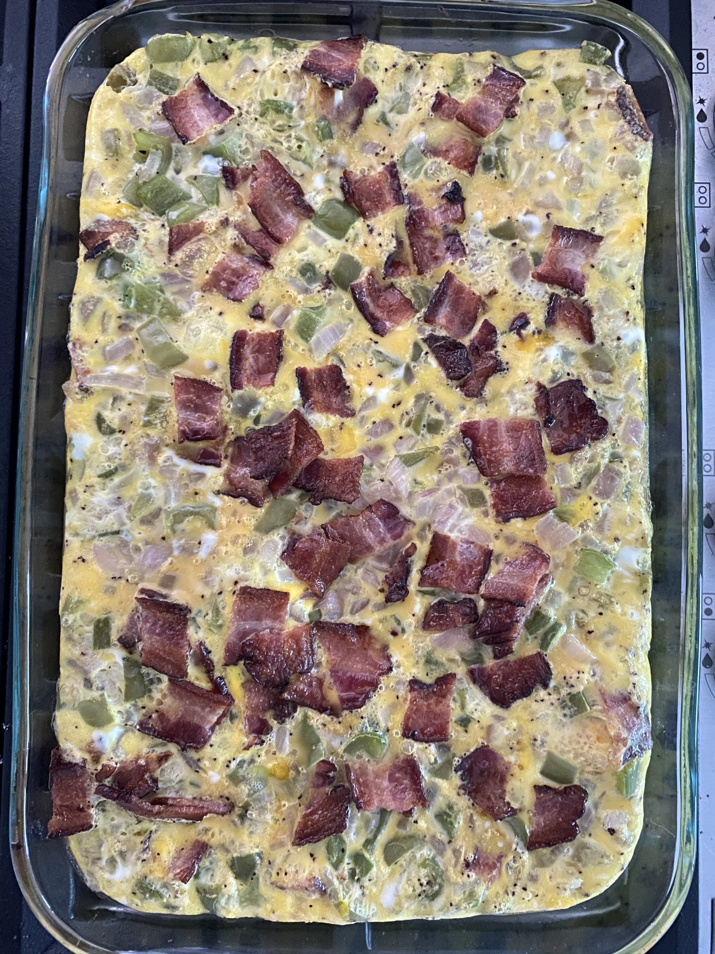 In the baking dish, layer the bell peppers, onions, chili peppers, bacon, and then pour the egg scramble on top.